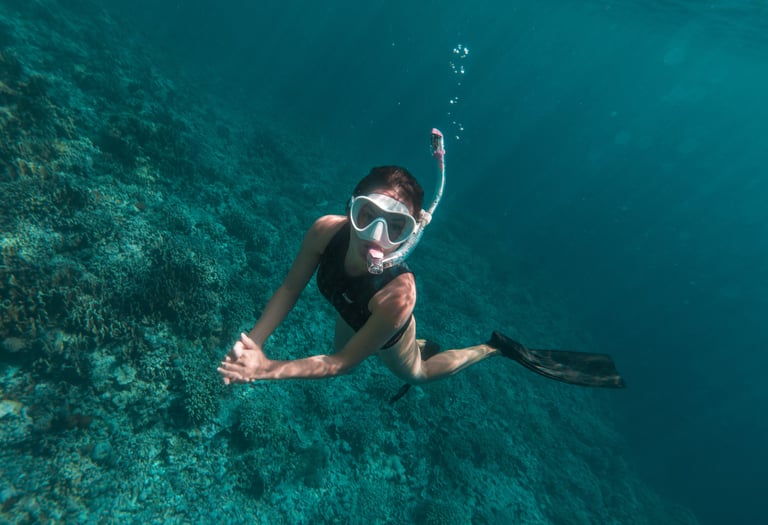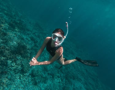 Esta maravillosa experiencia consiste en desplazarse nadando sobre la superficie del mar equipado con un par de aletas, un visor y un snorkel y de este modo poder observar los arrecifes y la fauna.